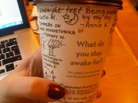 | Paper Cups with Scribbled Answers to “What do you stay awake for?” |