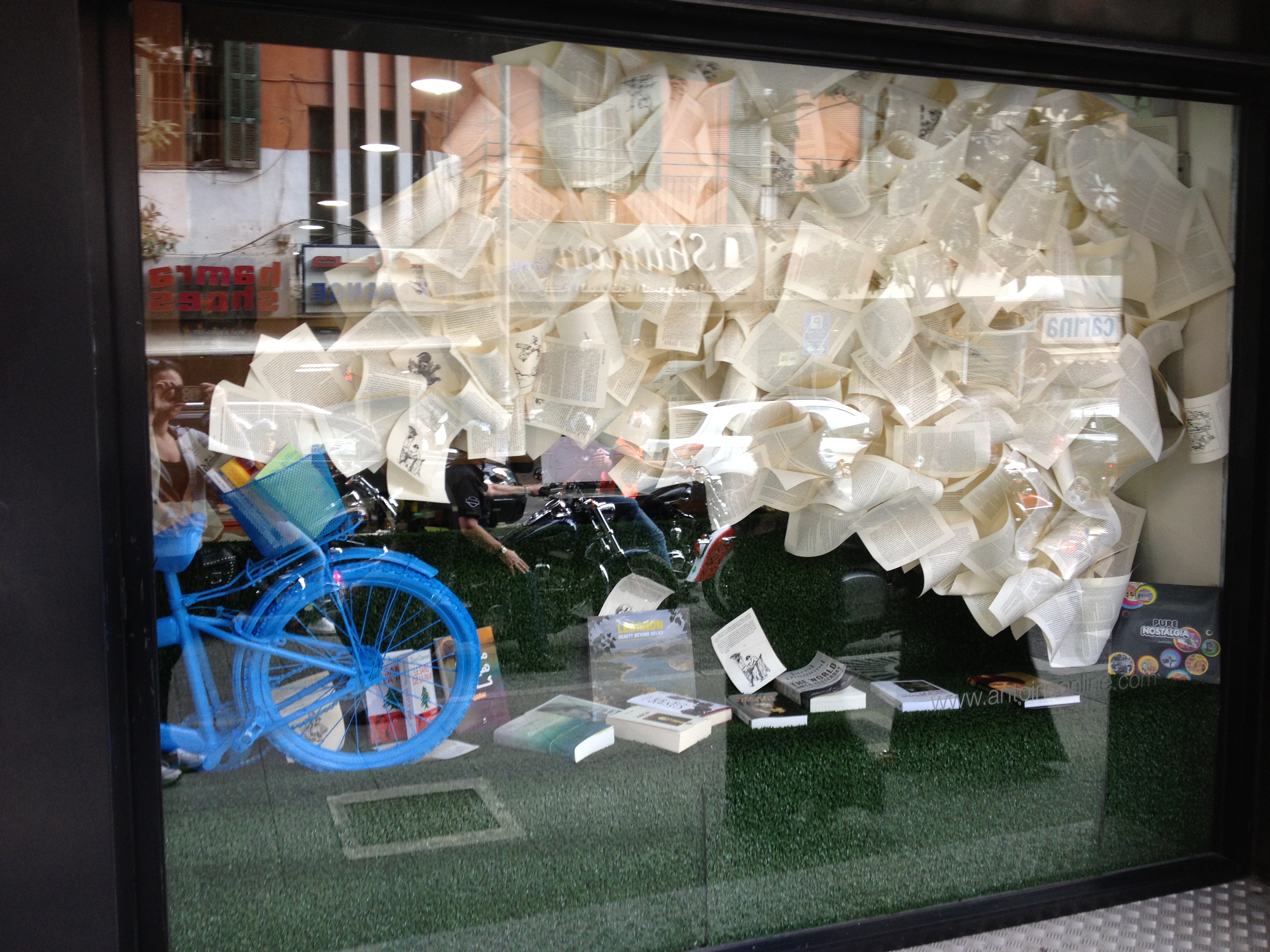 This Box was found today while wandering in Hamra. It features a little member of society: Librairie Antoine. Very similar to the Louis Vuitton flying papers of this season (I’m sorry but I can’t help but praise them – even in Singapore, I’d stop and admire each display even though they were all identical). Back to the point. Librairie Antoine has a small bicycle featuring a crazy cascade of book pages flying all over the span of the vitrine. You should stop by just to take a look and read some of the pages.