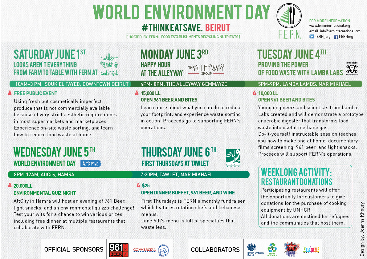 The kickoff, taking place on June 1st, is in collaboration with UN agencies (UNESCWA and UNHCR) and local organizations. The other events that follow throughout the week are strictly FERN & corresponding collaborators (as listed on the schedule below). Anyway, the kickoff will be bright and early (9am) at Souk El Tayeb in the Downtown square parallel to the fancy shmancy my-wallet-hates-you Librairie Antoine. The theme for this year is “Think.Eat.Save”, revolving around food waste.