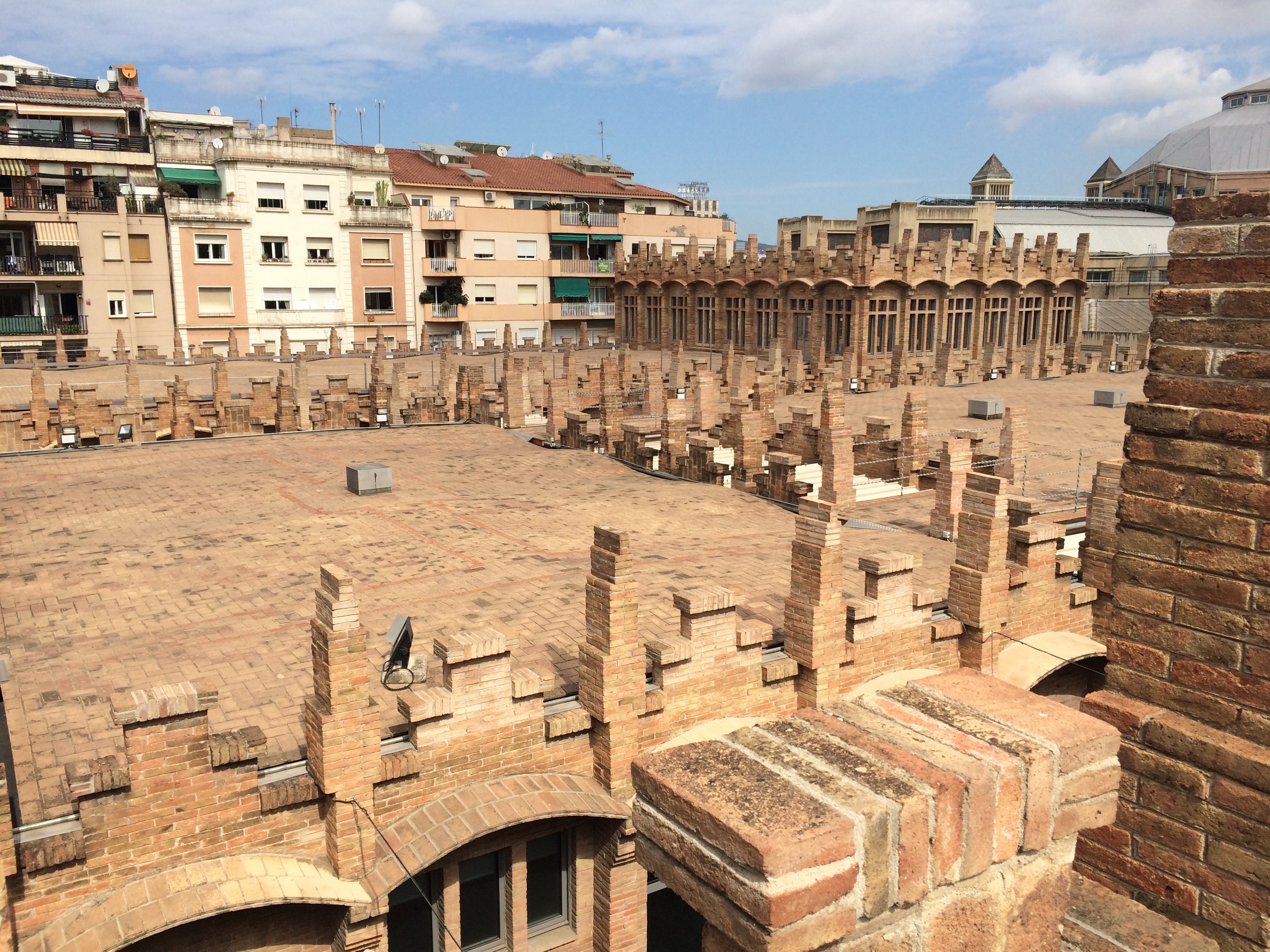 Facing Mies van de Rohe’s German Pavilion in Montjuic is a medieval brick castle with two towers. This is CaixaForum, the cultural center of Barcelona. Although it houses exhibitions and an excellent bookshop, it used to be a textile factory in the early 1900s. Built in two years thanks to repetitive architectural patterns, the factory was dedicated to cotton production. The large windows, high ceilings, and separated pavilions helped with ventilation and created a large open workspace so workers didn’t feel trapped underground. Because it’s only made of brick and iron, there was also very little risk of fire. The flower bed skylights enabled fire brigades to reach any part of the factory but also doubled as a source of air and natural light. Besides light and space, it was the first factory to use electricity so there were no chimneys and, thus, no risk of respiratory diseases from coal and steam that previously powered looms.